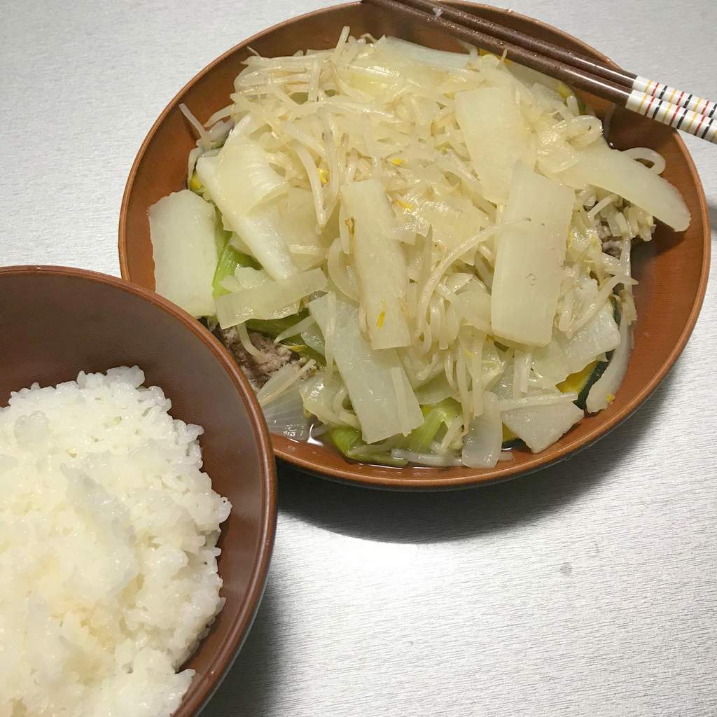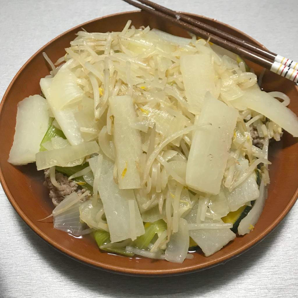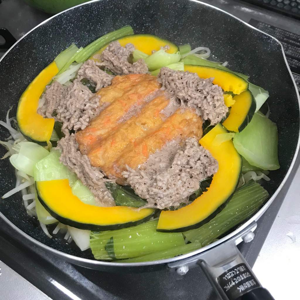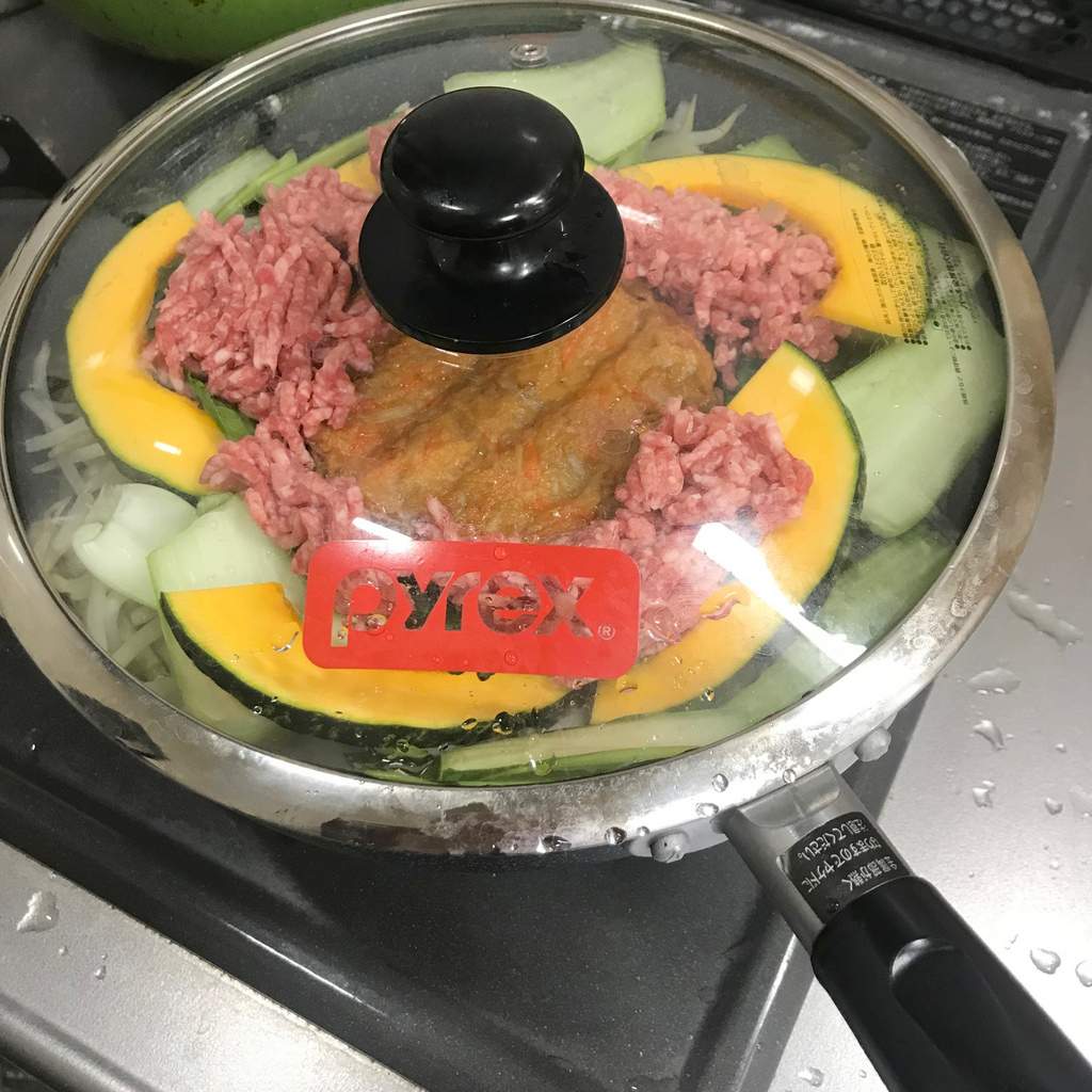 今回は、オリーブオイル、大根、もやし、青梗菜、かぼちゃ、がんもどき、豚ひき肉、の順に乗せました。