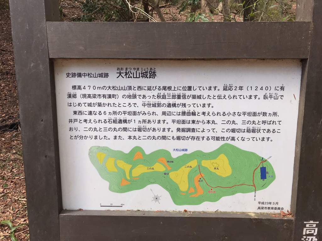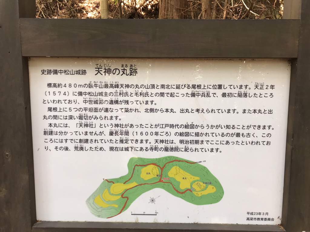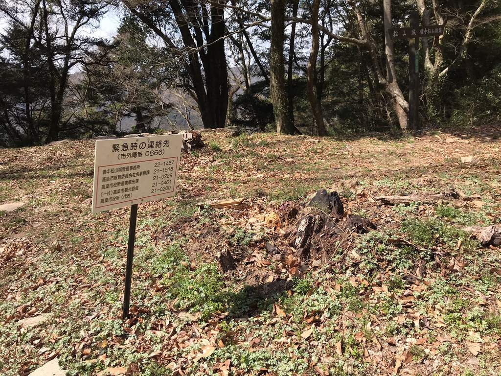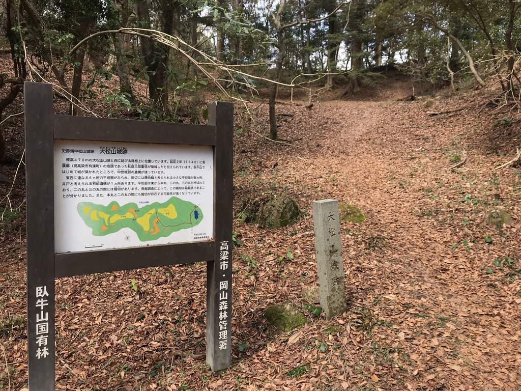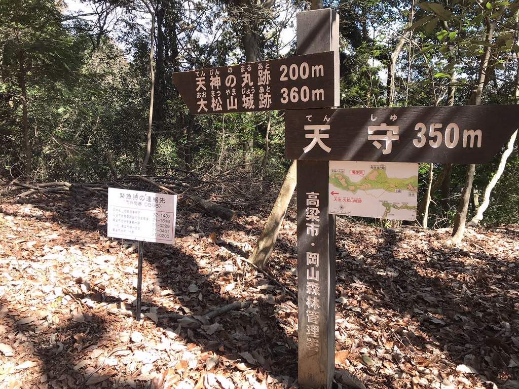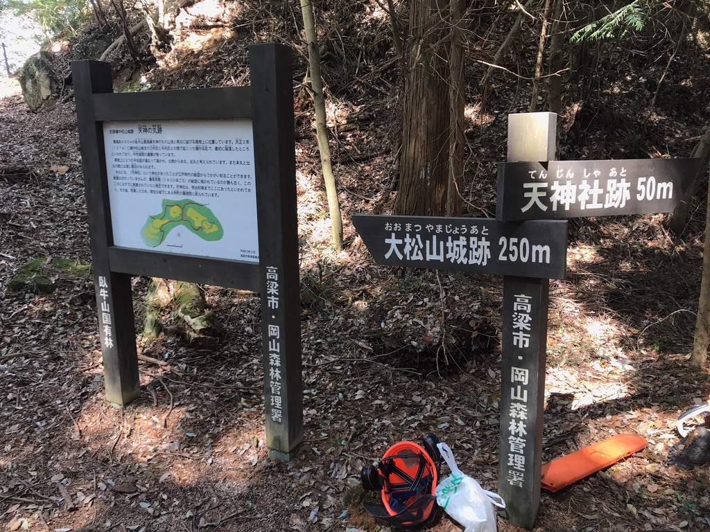 暫く歩くと、天神の丸跡と大松山城跡を示す札が見えてきます。